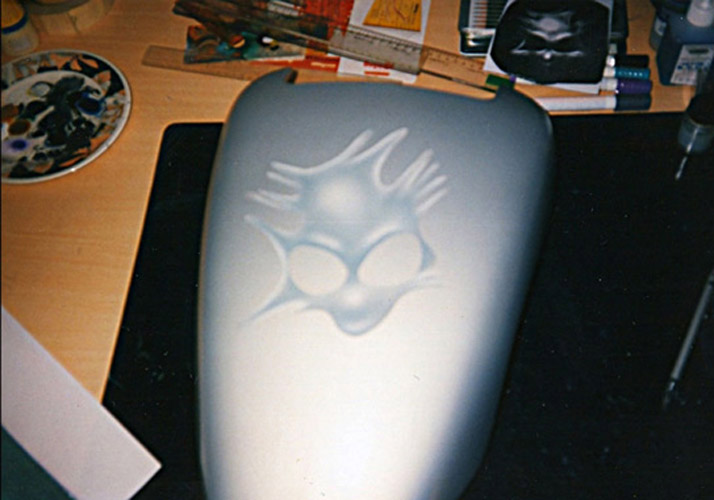 Collage Motorradlackierung.  Alien aus Motorradtank, 1996. Eine Lackierung von Siko Ortner für Dirk. Halbvollendete Airbrushlackierung. Alien aus Motorradtank 1996. Eine Lackierung von Siko Ortner für Dirk. Vollendete Airbrushlackierung. Alien aus Motorradtank 1996. Eine Lackierung von Siko Ortner für Dirk.