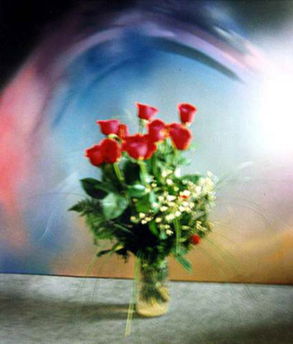 Titel: Arrangement Leinwand die Liebe (Aerosolart) mit einem Rosenstrauß