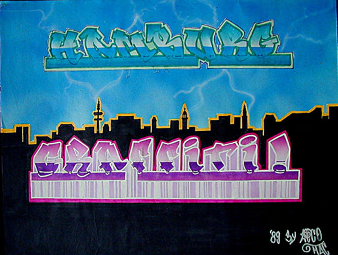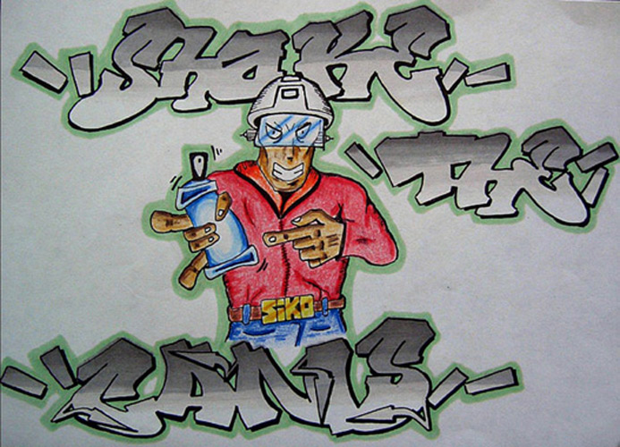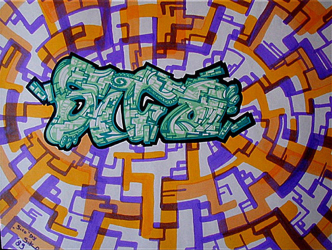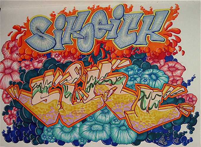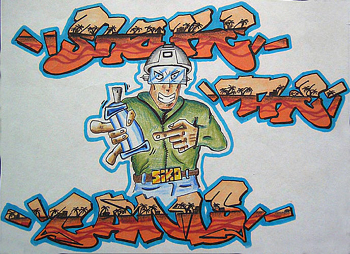 Hamburg Graffiti, Farbentwurf, Filzstift, Lackstift und Stoffmalfarbe auf Papier von Siko Ortner, 31cm X 42cm, 1989. Industrial society (Sico style), Farbentwurf, Filzstift auf Papier von Siko Ortner, 31cm X 42cm, 1989. Shake the cans I, Farbentwurf,  Filzstift und Buntstift auf Papier von Siko Ortner, 15cm X 15cm, 1990. Shake the cans II, Farbentwurf,  Filzstift und Buntstift auf Papier von Siko Ortner, 15cm X 15cm, 1990. Sikoqick Siko style (quik ist nicht schnell), Farbentwurf,  Filzstift auf Papier von Siko Ortner, 30cm X 41,5cm, Februar 2006. Golem, Farbentwurf,  Filzstift und Buntstift auf Papier von Siko Ortner, 15cm X 20cm, 2006.