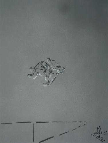 Sprühtechnik zum Graffitibild (Stencilgemälde), die auf den ersten Blick wie Kohlezeichnungen mit weißen Erhöhungen erscheinen.