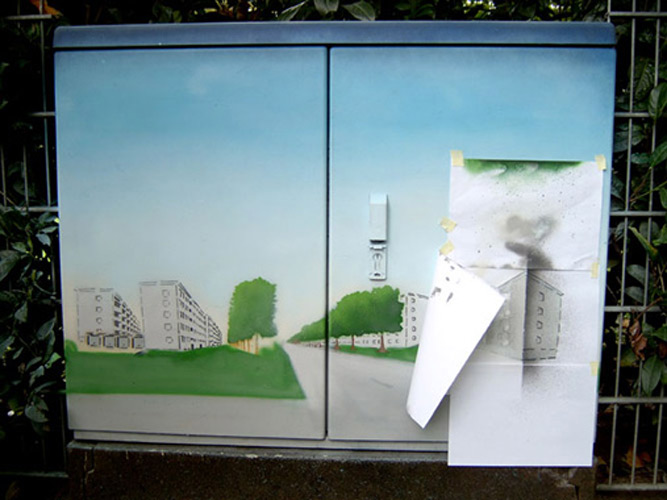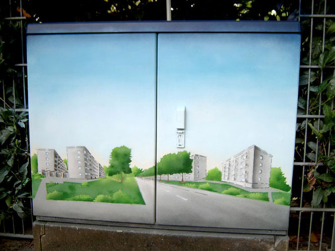 Aktiv für die Vahr. Ein Projekt von JUS, Bremen (die Maulwürfe) vom Oktober bis November 2007. Die Graffitiwerkstatt wurde durchgeführt von Siko Ortner als offenes Atelier für Jugendliche aus dem Stadtteil. Außerdem waren täglich bis zu 5 Kursteilnehmer direkt von JUS dabei. Probestancel Wohnblock auf einem A4 Papier. Kunst im öffentlichen Raum. Stancelart / Schablonengraffiti. Aktiv für die Vahr. Ein Projekt von JUS, Bremen (die Maulwürfe) vom Oktober bis November 2007. Die Graffitiwerkstatt wurde durchgeführt von Siko Ortner als offenes Atelier für Jugendliche aus dem Stadtteil. Außerdem waren täglich bis zu 5 Kursteilnehmer direkt von JUS dabei. Probestancel auf einem A4 Papier.  Kunst im öffentlichen Raum. Stancelart / Schablonengraffiti. Aktiv für die Vahr. Ein Projekt von JUS, Bremen (die Maulwürfe) vom Oktober bis November 2007. Die Graffitiwerkstatt wurde durchgeführt von Siko Ortner als offenes Atelier für Jugendliche aus dem Stadtteil. Außerdem waren täglich bis zu 5 Kursteilnehmer direkt von JUS dabei. Anfang Oktober 2007 Projektbeginn bei Nieselregen und Temperaturen knapp über 10 Grad Celsius. Kunst im öffentlichen Raum. Stancelart / Schablonengraffiti auf einem Stromkasten in der Neuen Vahr in Bremen. Aktiv für die Vahr. Ein Projekt von JUS, Bremen (die Maulwürfe) vom Oktober bis November 2007. Die Graffitiwerkstatt wurde durchgeführt von Siko Ortner als offenes Atelier für Jugendliche aus dem Stadtteil. Außerdem waren täglich bis zu 5 Kursteilnehmer direkt von JUS dabei. Jetzt fehlen nur noch die Details.  Kunst im öffentlichen Raum. Stancelart / Schablonengraffiti auf einem Stromkasten in der Neuen Vahr in Bremen. Aktiv für die Vahr. Ein Projekt von JUS, Bremen (die Maulwürfe) vom Oktober bis November 2007. Die Graffitiwerkstatt wurde durchgeführt von Siko Ortner als offenes Atelier für Jugendliche aus dem Stadtteil. Außerdem waren täglich bis zu 5 Kursteilnehmer direkt von JUS dabei. Ergänzt sind hier bereits die Sträucher und Grünflächen sowie die Fensterscheiben. Kunst im öffentlichen Raum. Stancelart / Schablonengraffiti auf einem Stromkasten in der Neuen Vahr in Bremen. Aktiv für die Vahr. Ein Projekt von JUS, Bremen (die Maulwürfe) vom Oktober bis November 2007. Die Graffitiwerkstatt wurde durchgeführt von Siko Ortner als offenes Atelier für Jugendliche aus dem Stadtteil. Außerdem waren täglich bis zu 5 Kursteilnehmer direkt von JUS dabei. Der fertiggestellte Stromkaste 01 ergänzt durch die Seifenblasen mit Stancelporträts von 4 JUS Mitarbeitern. Kunst im öffentlichen Raum. Stancelart / Schablonengraffiti auf einem Stromkasten in der Neuen Vahr in Bremen. Aktiv für die Vahr. Ein Projekt von JUS, Bremen (die Maulwürfe) vom Oktober bis November 2007. Die Graffitiwerkstatt wurde durchgeführt von Siko Ortner als offenes Atelier für Jugendliche aus dem Stadtteil. Außerdem waren täglich bis zu 5 Kursteilnehmer direkt von JUS dabei. Der fertiggestellte Stromkaste 01 Zoom in das Stancelgemälde zwischen  Häuserschlucht und Allee. Kunst im öffentlichen Raum. Stancelart / Schablonengraffiti auf einem Stromkasten in der Neuen Vahr in Bremen. Aktiv für die Vahr. Ein Projekt von JUS, Bremen (die Maulwürfe) vom Oktober bis November 2007. Die Graffitiwerkstatt wurde durchgeführt von Siko Ortner als offenes Atelier für Jugendliche aus dem Stadtteil. Außerdem waren täglich bis zu 5 Kursteilnehmer direkt von JUS dabei. Der fertiggestellte Stromkasten 01 Zoom in das Stancelgemälde zwischen  Häuserschlucht und Allee. Kunst im öffentlichen Raum. Stancelart / Schablonengraffiti auf einem Stromkasten in der Neuen Vahr in Bremen. Aktiv für die Vahr. Ein Projekt von JUS, Bremen (die Maulwürfe) vom Oktober bis November 2007. Die Graffitiwerkstatt wurde durchgeführt von Siko Ortner als offenes Atelier für Jugendliche aus dem Stadtteil. Außerdem waren täglich bis zu 5 Kursteilnehmer direkt von JUS dabei. Fertiggestellter Stromkasten 01 Zoom auf die Seifenblasen mit den Stancelporträts Kunst im öffentlichen Raum. Stancelart / Schablonengraffiti auf einem Stromkasten in der Neuen Vahr in Bremen.