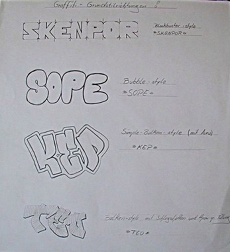 Theoretische Einweisung in die Graffiti-Grundstielrichtungen von 1989 für einen einwöchigen Graffitikurs beim Arbeitsamt Hamburg entworfen von Siko Ortner.